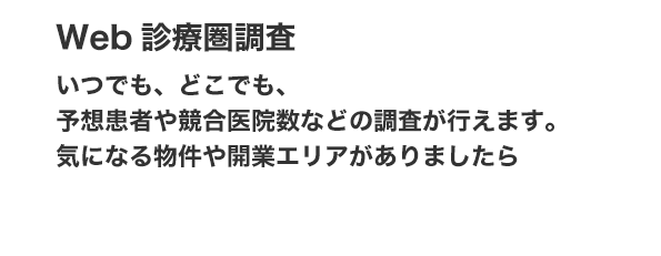 当サイトにご登録いただけると、何時でも、何処でも、何度でもご自身で医院開業物件・クリニック開業物件の診療圏調査を行うことができます。登録は無料です。