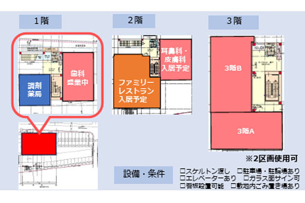 | 担当者から一言 | 【クリニック開業・医院開業物件お問い合わせNo、T-460】 2025年6月竣工予定 【4階 A/B】 眼科 2026年6月開業予定 【3階 A/B】 面積:34.79坪 /41.54坪 賃料(坪):12,000円 (税込13,200円) 共益費・管理費:2,000円/坪 (税込) 【2階】 耳鼻科・皮膚科2026年3月開業予定 【1階】調剤薬局入居予定 2026年3月開局予定 契約:定期賃貸借/20年 保証金:6ヵ月 礼金:1ヵ月 仲介手数料:1ヵ月 ※2区画使用可 設備・条件:スケルトン渡し、駐車場・駐輪場あり、エレベーター1基 新築、角地で視認性も高く、駐車場多数あり! 25年10月以降開業可能予定です。 周辺地域、高齢者比率高い! 建物1,2階に飲食店開業予定。 |