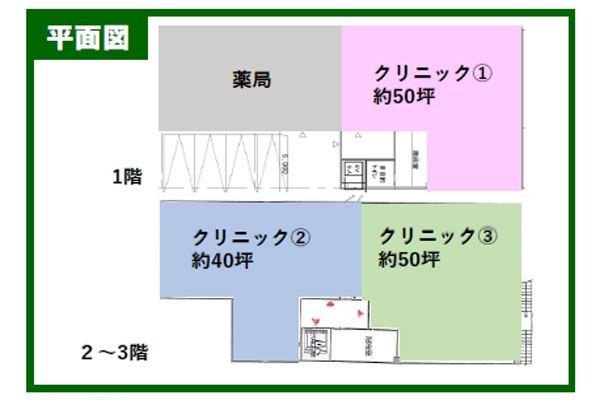 担当者から一言 | 【クリニック開業・医院開業物件お問い合わせNo、S-137】 【3階④】約91坪 13,000円/坪(税別・共益費別) 【2階③】約50坪 14,000円/坪(税別・共益費別) 【2階⓶】約40坪 14,000円/坪(税別・共益費別) 【1階①】約50坪 15,000円/坪(税別・共益費別) 契約形態:定期借家契約 |