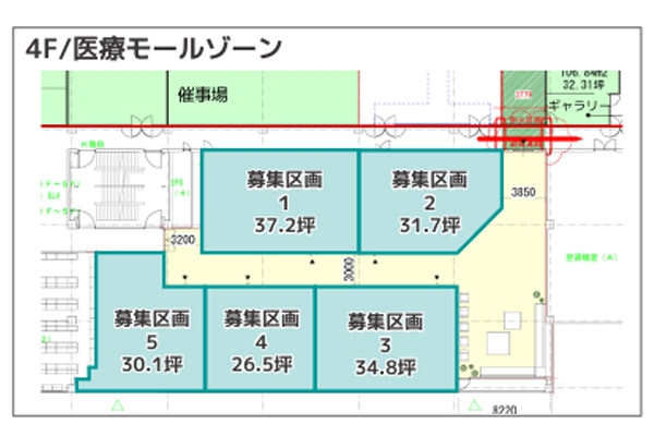 | 担当者から一言 | 【クリニック開業・医院開業物件お問い合わせNo、K-305】 ■募集区画 【4階】 区画1:37.2坪 区画2:31.7坪 区画3:34.8坪 区画4:26.5坪 区画5:30.1坪 月額賃料:12,000円/坪(税別・共益費込) 契約形態: 定期建物賃貸借契約(契約年数応相談) 保証金:賃料12か月分 販促費:月額30,000円 駐車場負担金:坪1,000円専門店 会費:入会金20,000円月会費3,000円 現場協力金:坪5,000円 内装管理費:坪5,000円 開店販促費:300,000円 仲介手数料:1か月分・駐車場4,000台収容・内装スケルトン渡し |