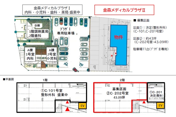 | 担当者から一言 | 【クリニック開業・医院開業物件お問い合わせNo、T-607】 2023年12月 竣工済 ■募集区画 【2階】② 2階202号室 43.09坪 【1階】① 1階101号室 整形外科 盛業中 2階201号室 整形外科 盛業中 坪単価(税抜):12,500円 月額賃料(税抜):538,625円 月額賃料(税込):592,488円 契約形態:普通建物賃貸借契約 契約年数:15年以上(応相談) 保証金:月額賃料の7ヶ月分(償却あり) 礼金:月額賃料の2ヶ月分 引渡し条件:スケルトン渡し 駐車場:敷地内に11台(月極14,300円/台) 備考:※エレベータあり |